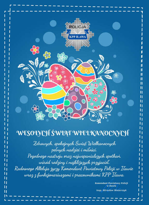 "Życzę Państwu, abyśmy wszyscy znaleźli czas na to, żeby w pełnym skupieniu docenić to, co najważniejsze, a więc tych, z którymi zasiadamy do świątecznych stołów" - wielkanocne życzenia insp. Mirosława Elszkowskiego Komendanta Wojewódzkiego Policji w Olsztynie