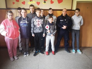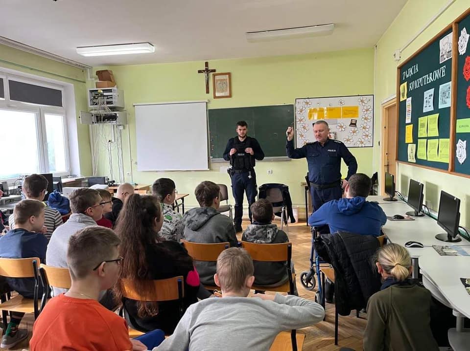 Wytłumaczyli uczniom czemu dzielnicowy nazywany jest „policjantem pierwszego kontaktu” i czym na co dzień się zajmuje. Dodając, że w jego pracy najważniejszy jest kontakt z obywatelami. Pomocna jest w tym aplikacja mobilna Moja Komenda oraz Krajowa Mapa Zagrożeń Bezpieczeństwa, z których możemy skorzystać mając np.: smartphona.