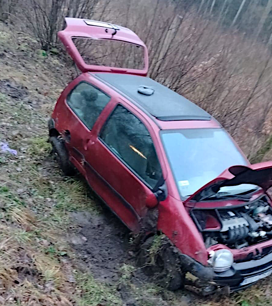 Natomiast na trasie Laseczno – Stradomno 49 - latek kierujący renaultem nie dostosował prędkości jazdy do warunków ruchu i po pokonaniu łuku drogi zjechał na przeciwległy pas ruchu, doprowadzając do wywrócenia pojazdu w przydrożnym rowie. Jedna z pasażerek z obrażeniami ciała została przetransportowana do szpitala.