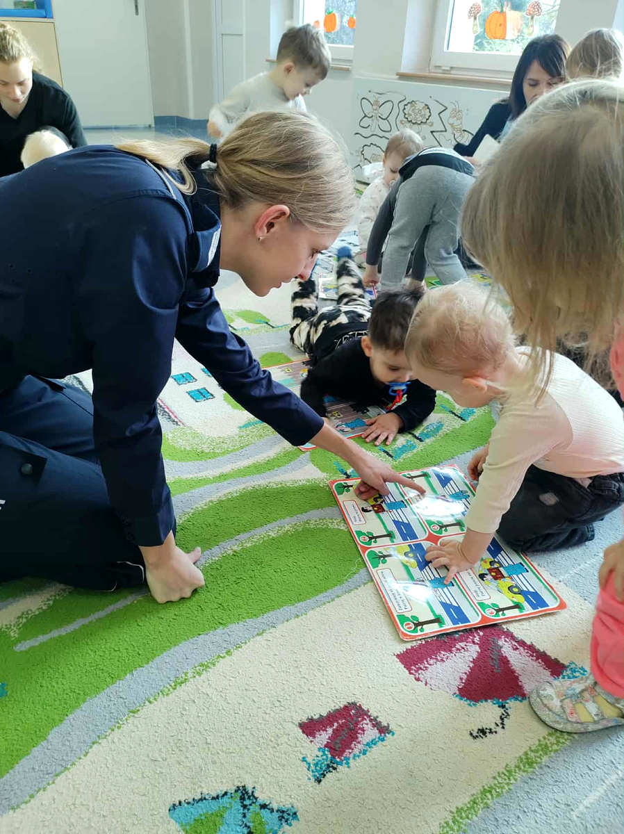 Wspólna zabawa pod okiem opiekunów i policjantek połączona była z uświadamianiem dzieci o tym jak zachować bezpieczeństwo w drodze do i ze żłobka. Podczas spotkania policjantki starały się przekazać informacje także o ewentualnych zagrożeniach podczas zabawy na podwórku, pobytu w domu i poza nim.