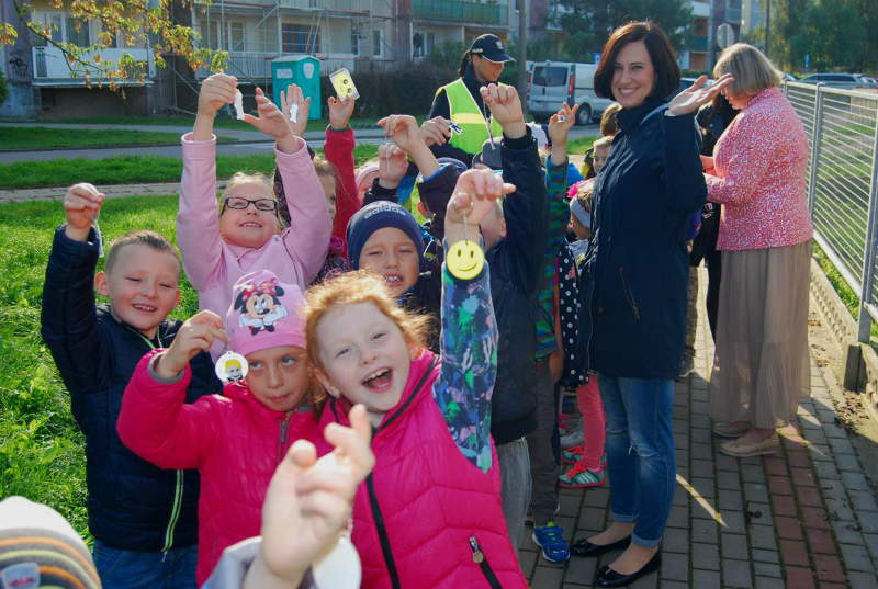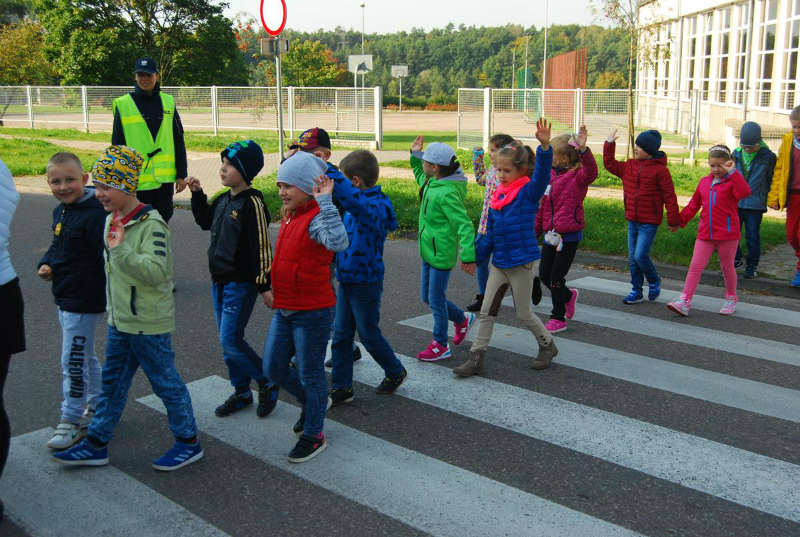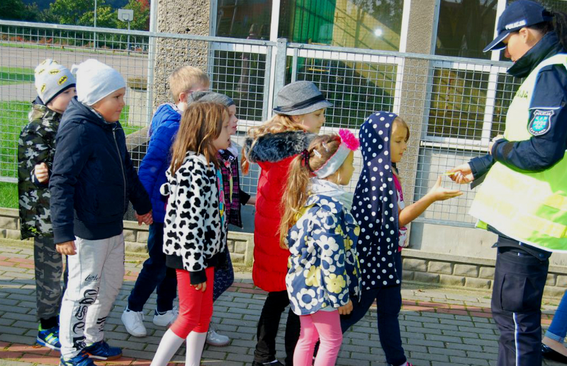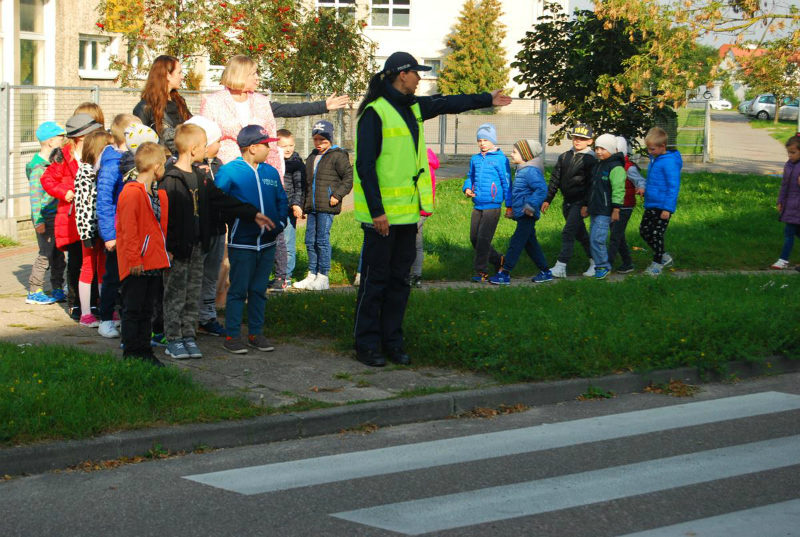 Najmłodsi uczniowie wspólnie z funkcjonariuszką przypomnieli sobie podstawowe zasady bezpieczeństwa obowiązujące na drodze, w tym prawidłowego przechodzenia przez jezdnię, korzystania z chodnika czy pobocza.