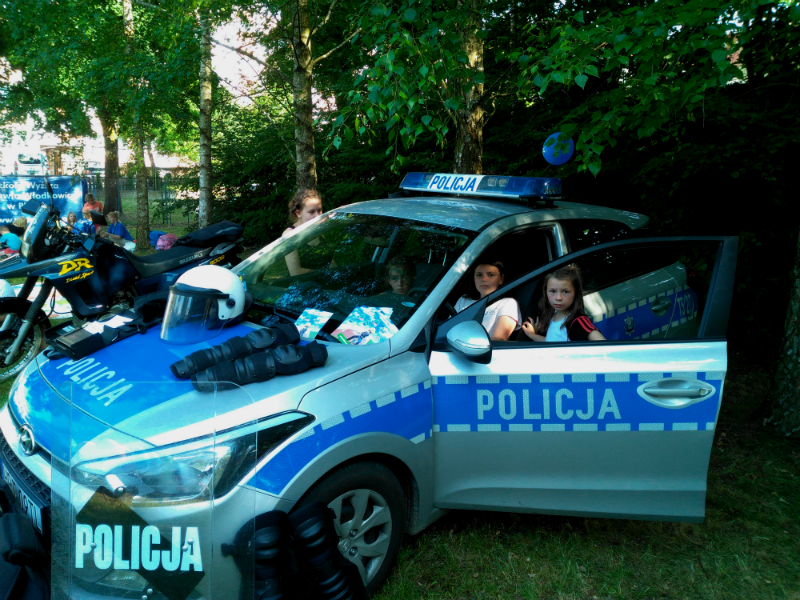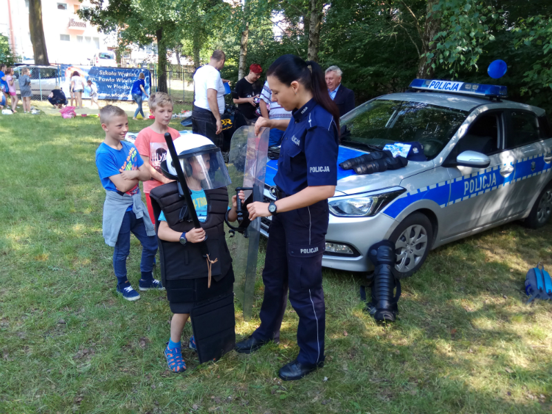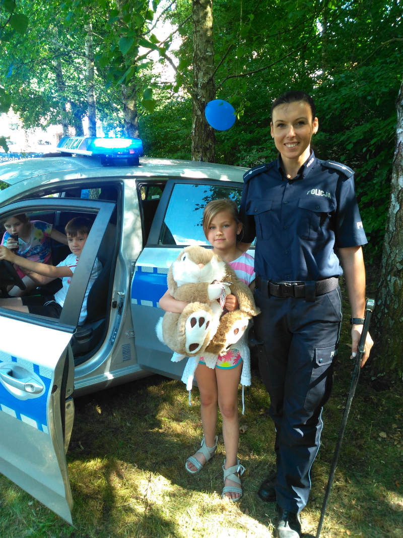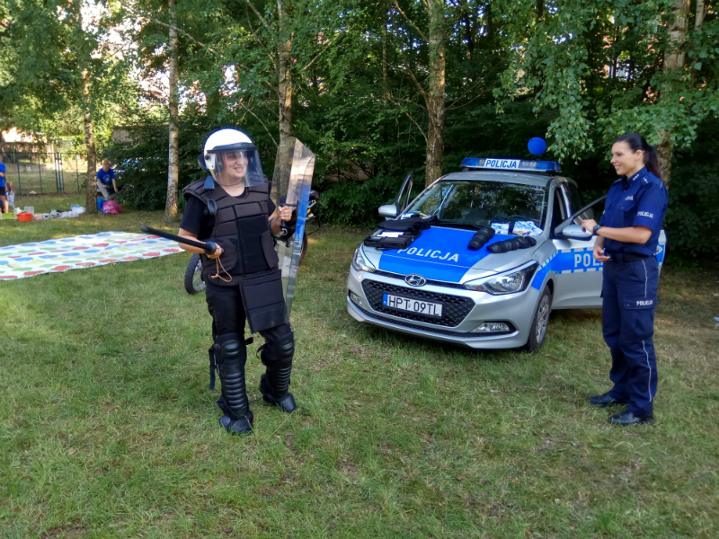 Festyn z okazji zbliżających się wakacji za nami. Piknik ten były okazją do wspólnego spędzenia pełnego atrakcji popołudnia i przy okazji spotkania i rozmowy z policjantką. Wszyscy uczestnicy zabawy przebierając się w zestaw przeciwuderzeniowy mogli przez chwilę być policjantem, który zabezpiecza imprezę masową. Natomiast przytulając otrzymanego od policjantki pluszaka przypomnieć sobie numery alarmowe.
