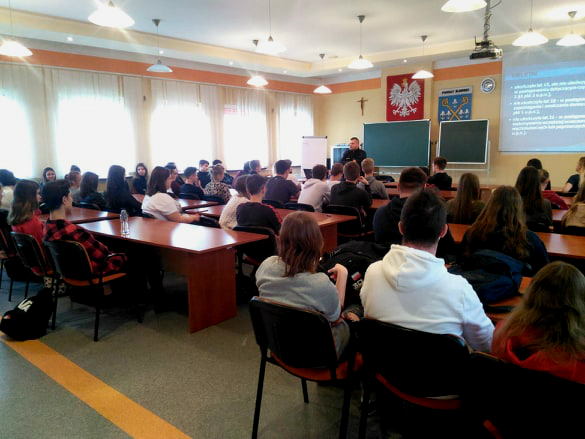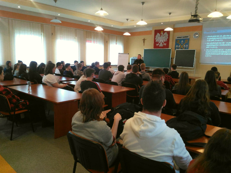 Policjanci poruszyli również tematy dotyczące narkotyków oraz dopalaczy, w tym rozpoznawanie symptomów zażywania ich przez młodzież. Uświadomili uczniów o konsekwencjach prawnych związanych z posiadaniem i sprzedażą narkotyków jak i dopalaczy. Policjanci w trakcie prelekcji przedstawili zebranym zagrożenia związane z eksperymentowaniem przez młodych ludzi z narkotykami, dopalaczami, alkoholem czy środkami odurzającymi omawiając temat ten na podstawie przygotowanych filmów jak i przykładów ze swojej pracy.