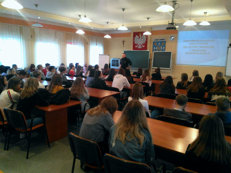 Funkcjonariusze Komendy Powiatowej Policji w Iławie w Zespole Szkół im. Stefana Żeromskiego w Iławie rozpoczęli cykl spotkań dotyczący odpowiedzialności karnej nieletnich. Dlatego funkcjonariusze spotkania rozpoczynali od omówienia, kto to jest osoba nieletnia oraz jakie ma prawa i obowiązki. Policjantka wytłumaczyła co oznacza określenie czyn karalny, omawiając jednocześnie kilka artykułów z kodeksu karnego, wykroczeń czy ustawy prawo o ruchu drogowy. Uczniowie dowiedzieli się, jak klasyfikowane są różne działania naruszające prawo i jaka grozi za nie kara. Policjantka również poinformowała uczestników spotkania co to jest demoralizacja, przedstawiając jednocześnie jakie środki wychowawcze i poprawcze mogą być zastosowane wobec osoby nieletniej a jakie wobec osoby pełnoletniej. Asp. szt. Dominik Siestrzewitowski podał liczne przykłady ze swojej pracy, obrazujące jak często z pozoru niewinne żarty prowadzą do nieszczęść, za które ktoś później odpowiada przed sądem. Poinformował uczniów, że kończąc 17 lat jest się pełnoletnim dla prawa czyli można otrzymać już swój pierwszy mandat, a nie dopiero w chwili otrzymania dowodu osobistego. Oświadczył, że nawet nie będąc tego świadomym wielokrotnie w ciągu jednego dnia wielu uczniów popełnia przestępstwa czy wykroczenia, które nie zawsze są zgłaszane na policję.