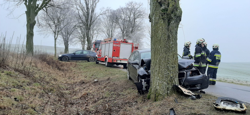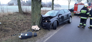 Natomiast w sobotę w godzinach porannych 25 – latek kierujący audi nie dostosował prędkości do warunków ruchu w wyniku czego stracił panowanie nad pojazdem zjechał na prawe pobocze i uderzył w przydrożne drzewo. Kierujący oraz jego czterech pasażerów zostało przetransportowanych do szpitali.
