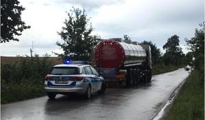 Natomiast kilka minut po godzinie 15:00 33 – latek kierujący zespołem pojazdów wraz z cysterną będąc na łuku drogi nie dostosował prędkości do warunków ruchu w następstwie czego naczepa zjechała na przeciwległy pas ruchu i doprowadziła do zderzenia bocznego z fiatem. Na szczęście cysterna była pusta i nikomu nic poważnego się nie stało. 33 – latek za spowodowanie zagrożenia w ruchu drogowym został ukarany mandatem.