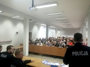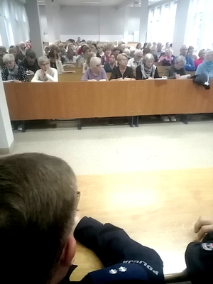 Następnie funkcjonariuszka zgodnie z głównym tematem debaty „Fałszywy telefon – zagrożone oszczędności” przestrzegała zgromadzonych seniorów przed oszustami wyłudzającymi różnymi metodami pieniądze od osób starszych. Omówiła sposoby oszustw na tzw. wnuczka, policjanta, funkcjonariusza CBŚ oraz inne, najbardziej znane metody, którymi posługują się oszuści. St. asp. Joanna Kwiatkowska apelowała również do uczestników spotkania, by byli bardziej asertywni, potrafili odmówić „udzielenia pomocy” osobie podającej się za członka rodziny czy urzędnika. Dodała, aby rozsądnie podchodzić do otrzymywanych wiadomości za pomocą różnych aplikacji. Oficer prasowy w myśl zasady „Bezpieczeństwo to nasza wspólna sprawa” przypomniała jeszcze kilka podstawowych zasad bezpieczeństwa. Omawiając co należy zrobić, aby nie stać ofiarami przestępców, którymi stają się zazwyczaj osoby roztargnione czy zbyt ufne.