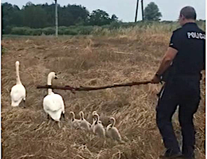 Służba w policji to nie tylko walka z przestępcami i wykrywanie różnych wykroczeń. Zdarzają się również nietypowe i wyjątkowe interwencje. Taką jak ta, którą przeprowadzili iławscy policjanci. W pobliżu miejscowości Boreczno interweniowali wobec łabędziej rodziny, która zmęczona upałem, idąc drogą szukała dostępu do wody.
